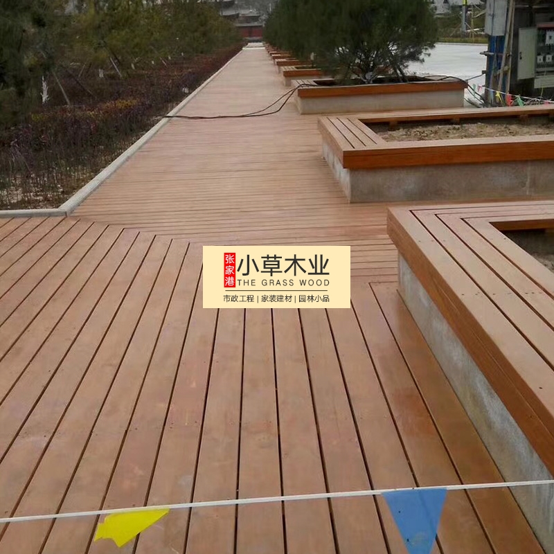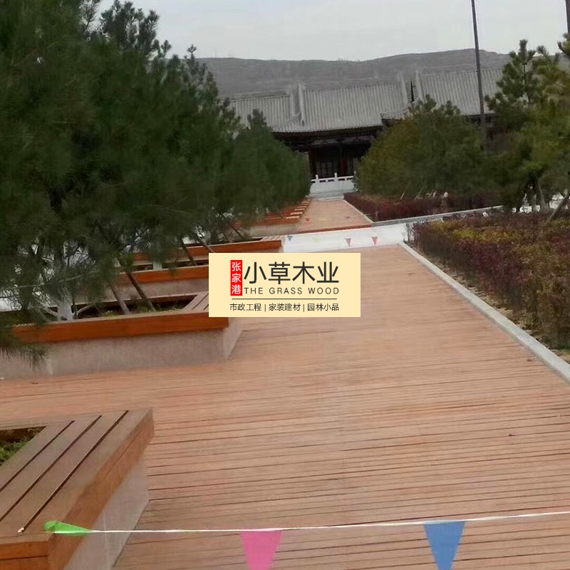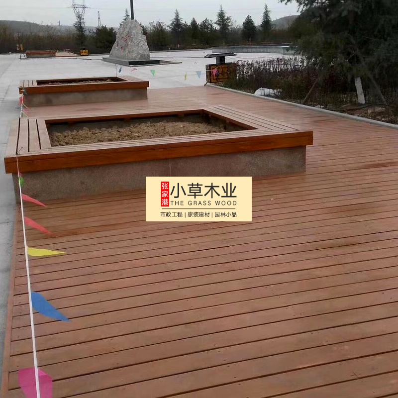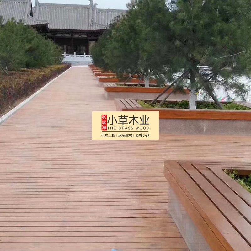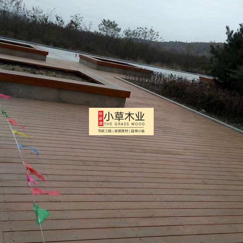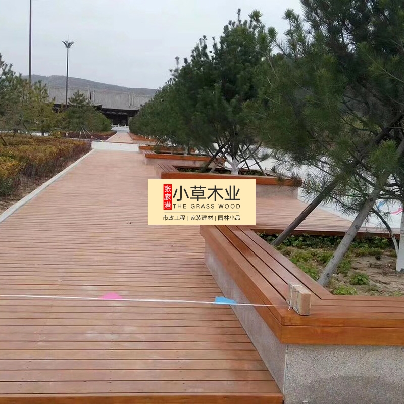 此項(xiàng)目采用的材料為:南美菠蘿格防腐木,表面刷栗色漆,使材料色差變小。