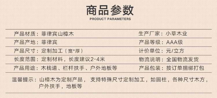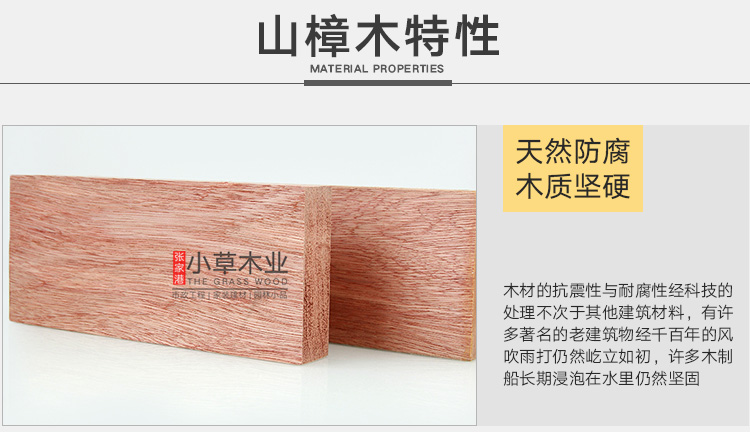 山樟木用途:適用于戶外地板、園林景觀、戶外防腐木、旋切單板、膠合板的芯板和背板、地板、家具、包裝箱、細(xì)木工板、重型工程、一般建筑用材、船龍骨、枕木等。